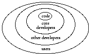 FIGURE 3.1. Single community built around source code.And, in fact, this view makes the hierarchy into a funnel in which the goal is to convert people from one ring in the diagram to people in the next one in--almost as if the goal were to turn people into code in the end, the highest form of existence. A direct result of this perspective is that the actual users of the program are marginalized. Although the success of the project is often measured by the number of people that use the computer program being developed, only those people who are willing and able to talk about the code can participate in discussions on the project's mailing lists. Major decisions are made by those writing the code, not by those who will only use it. If we step back a bit, we can see that the people involved in an open-source project take on various roles. Over time they may act as users, designers, or coders. So a better diagram looks like Figure 3.2. Here the code is still at the center; users, designers, and coders can look at the code, but only the core coders deal directly with the code. We use the term coder rather than developer to emphasize the roles being played: A coder is someone who manipulates code, either by writing new code to implement some design feature or by inspecting and correcting existing code someone else has written. The thin solid black lines in Figure 3.2 indicate changes to the source code, the dotted lines indicate viewing the source code and interacting with the program, and the thicker, black lines indicate communications between people in the different roles. Note that the ovals representing the different roles are not drawn to scale; the users' circle should be much, much bigger for any healthy open-source project.