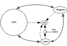 FIGURE 3.2. Different roles, still focused on code.This is still a view that focuses on the source code, but it brings out that design is separate from coding and that designers need not be coders. It also reflects the fact that people in the community may not simply advance from user to core developer in a linear progression but adopt the roles that make sense for what they are doing at the moment. If we step back still further and look at all the ways that people interact in the context of an open-source project, we see they do so in many different ways, such as: