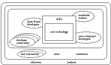 FIGURE 3.5. Multiple NetBeans products and uses.There are several distinct user communities. First, there are those developers using NetBeans as an IDE to create Java applications--their concern is how to best use NetBeans to write Java programs. There is also a geographical information system (GIS) built using the NetBeans framework--users of that application are not involved with any programming; they want to discuss issues around using GIS. When the NetBeans IDE is enhanced to handle languages in addition to Java, such as C/C++, then there will be a new user community of C/C++ developers. Note that in the diagram in Figure 3.5 the oval labeled Users should be several orders of magnitude larger than all of the other ovals; the users number in the tens or hundreds of thousands, whereas the people modifying the NetBeans code are in the hundreds. For NetBeans to be a success, all of these communities need to be successful. Each must grow for NetBeans to prosper. NetBeans provides another example of how an open-source project can involve multiple communities, in this case three very different cultures: At Sun, the NetBeans open-source project arose from the simultaneous acquisitions of NetBeans, a small startup company in Prague, Czech Republic, and Forte Software, a company based in Oakland, California. These two companies joined Sun's existing Tools organization, bringing together three companies, with three different corporate cultures, sets of values, day-to-day processes, and business goals. This was a challenging acquisition integration task. Unifying three different corporate cultures and day-to-day processes would be challenging enough; however, the bigger challenge may have been that the Tools organization was now spread across three different sites (Menlo Park, Oakland, and Prague). Recall that distributed development is fundamental to the open-source methodology. It is simply assumed. So the open-source methodology represented both a natural solution for the Tools organization's physical distribution and a neutral fourth methodology to bridge the differences in corporate cultures and processes. Other ProjectsNote that the users for both Jini and NetBeans are still mainly programmers. If we look at a project such as OpenOffice.org, which is aimed at creating an office suite for anyone to use, then the diversity of the communities becomes even clearer. OpenOffice.org is the open-source project based on Sun's StarOffice product, a multiplatform office productivity suite that includes the key desktop applications, such as a word processor, spreadsheet, presentation manager, and drawing program, with a user interface and feature set similar to those of other office suites. OpenOffice.org has groups focused on creating better user documentation, marketing and promoting OpenOffice, and usability issues. The basic community of people using OpenOffice has split to include (as of March 2004) new groups for native-language discussion forums in over two dozen languages, including Arabic, Chinese, Dutch, French, German, Hindi, Italian, Japanese, Russian, Spanish, and Portuguese. Hewlett-Packard was the central member of a printing community for Linux.1 IBM is the primary sponsor of an open source project for a Java-based universal tool platform and IDE called Eclipse,2 which, as of March 2004, spun off from immediate IBM control to become a nonprofit foundation. Within Eclipse, there are communities for such things as the basic platform, the Java IDE itself, for a variety of tools, for AspectJ, and for numerous other plug-ins and technologies. Each has its own mailing list, and there are a variety of newsgroups. The Eclipse project is discussed in depth in the section The Eclipse Story in Chapter 4. Looking beyond the CodeAn open-source project has many different communities, each with a different purpose. For a successful project, each of these communities must be nurtured and helped to grow. In a successful community a vocabulary might spring up that is derived from the project's technology, application area, and existing culture. Such a community will come to resemble a long-existing club with its own phrases, in-jokes, rituals, and customs--an astute creator of such a community will know this and will help the community grow these aspects. A less astute one will focus on the code, probably leaving out vital potential members of the community. One way to make the focus go beyond the code is to actively make roles for nondevelopers such as user interface (UI) designers and documentation writers. For example, NetBeans has a communitywide mailing list dedicated to the design and discussion of UI issues. There is also a NetBeans project focusing on UI development and issues, plus a process for other developers to get UI design assistance from the members of the UI project. When the NetBeans project first started, there was a hesitancy to add nondeveloper roles because this wasn't something that the high-profile open-source projects such as Apache or Linux did. Now the community values the work of the UI group. A similar example is the recent addition of a usability group as part of the GNOME project--its work has been welcomed by the larger GNOME community as something long needed. There are notable examples of communities that work together in an open-source-like way that do not involve software source code. One of the most interesting is Wikipedia.3 Wikipedia is an encyclopedia contributed entirely by volunteer efforts, using WikiWikiWeb technology at its base. In only 3 years, the online community has written over 230,000 entries. (Wikis are described in the section The WikiWikiWeb in Chapter 8.) Once companies involved with open-source projects realize that all of these other communities exist, they can consider business reasons for interacting with them--informal channels to customers, collaborations, and sources of innovation, for example. By cultivating new communities around user inte